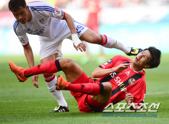 FC 서울과 수원 삼성의 K리그 클래식 2015 18라운드 '슈퍼매치'가 27일 서울월드컵경기장에서 열렸다. 서울 정조국이 공격을 시도하다 수원 곽희주의 수비에 막혀 넘어지고 있다. 서울월드컵경기장=정재근 기자 cjg@sportschosun.com/2015.06.27/