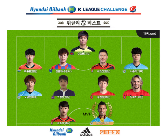 조나탄과 함께 경남의 김슬기가 1골을 넣으며 최고 포워드가 됐다. 미드필더에는 알미르와 공민현(이상 부천) 고경민(안양) 노병준(대구)가 뽑혔다. 수비수도는 배효성(경남) 김윤재(수원FC) 백종환(강원) 이준희(대구)가, 최고 골키퍼에는 강진웅(고양)이 선정됐다. 이 건 기자 bbadagun@sportschosun.com