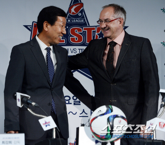 첫 선수 선발 추첨부터 화기애애했다. 골키퍼 우선 선발권을 뽑은 슈틸리케 감독의 첫 선택은 권순태(전북)였다. 최근 2년간 K리그에서 최고의 활약을 펼치고 있는 권순태지만 슈틸리케 감독은 그를 끝내 선발하지 않았다. 그러나 올스타전에서 슈틸리케 감독은 권순태를 처음으로 자신의 품에 안았다. 이유가 있었다. "어려운 결정은 아니다. 권순태가 이전 대표팀 소집 때 논란 많았는데 이번 기회를 통해 점검하기 위해 뽑았다. 이번에도 만약에도 권순태를 안뽑으면 악연이 있다고 오해할까봐 뽑았다(웃음)." 농담과 진담이 섞였다. 그러나 진지함을 버리지는 않았다. 그는 '권순태가 올스타전에서 활약하면 대표팀 선발이 가능한가'라는 질문에 정색하며 답했다. "그동안 권순태를 뽑지 못한 이유는 세 명의 대표팀 골키퍼가 워낙 잘했기 때문이다. 권순태의 활약도 좋지만 권순태도 기존 골키퍼들이 좋은 활약을 하고 있다는 것을 인정하고 있을 것이다."