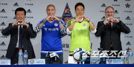'2015 하나은행 K리그 올스타전' 팀 최강희 VS 팀 슈틸리케의 기자회견이 2일 서울 신문로 축구회관에서 열렸다. 차두리, 최강희 감독, 슈틸리케 감독, 염기훈이 유니폼과 함께 포즈를 취하고 있다. 올해 K리그 올스타전은 K리그 클래식에서 전북을 단독 선두로 이끈 최강희 감독과 지난해 부임해 한국 축구의 변화를 이끌고 있는 울리 슈틸리케 축구 국가대표팀 감독의 대결로 벌어진다. 허상욱 기자 wook@sportschosun.com/2015.07.02/