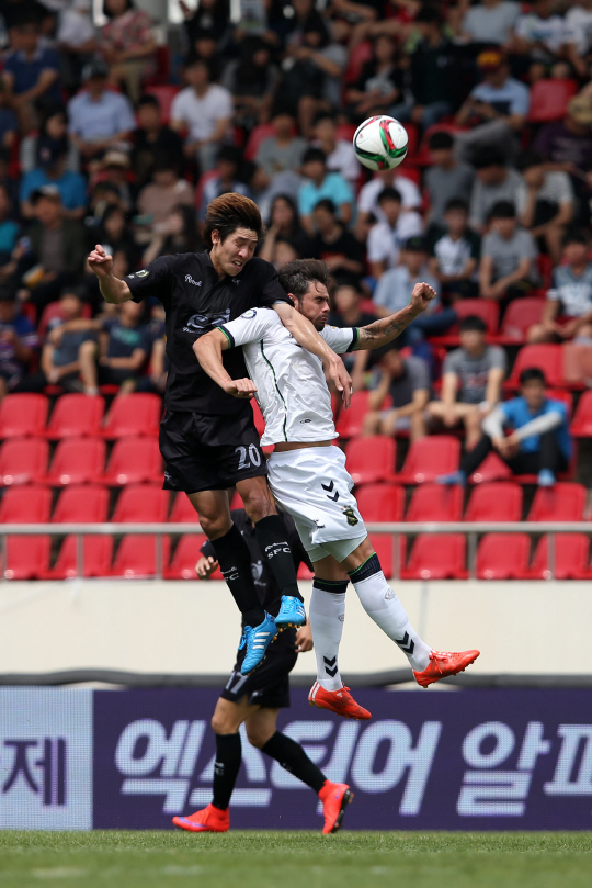 | ◇윤영선(왼쪽)이 지난 5월 31일 탄천종합운동장에서 열린 전북과의 2015년 현대오일뱅크 K리그 클래식 경기서 에두와 공중볼을 다투고 있다. ◇사진제공=한국프로축구연맹 |