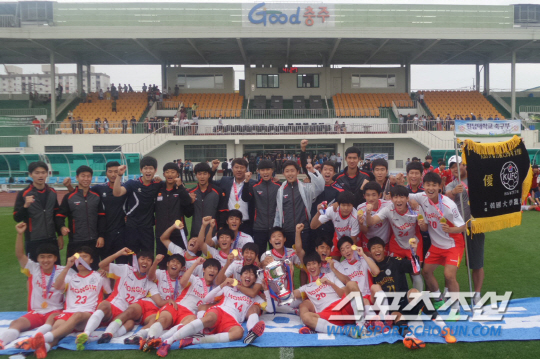 홍익대가 7일 충주공설운동장에서 열린 KBSN 제11회 1,2학년축구대회에서 우승했다. 선수들이 기뻐하고 있다. 충주=이 건 기자 bbadagun@sportschosun.com