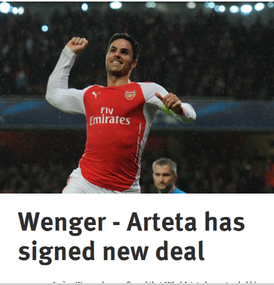 아스널은 9일(한국시각) 아르센 벵거 감독의 입을 통해 아르테타의 재계약을 발표했다. 벵거 감독은 "아르테타는 우리와 함께 1년 더 함께할 것이다. 우린 계약 연장에 합의했다"고 밝혔다. 그리고 "다음 시즌에 치를 경기 수를 고려하면 우리에게는 아르테타의 경험과 열정이 절대적으로 필요하다"고 설명했다. 아스널은 다음 시즌 유럽챔피언스리그와 병행해야 한다. 벵거 감독은 "주장인 아르테타는 우리 구단의 리더다. 지난 시즌보다 클럽에 더 많이 기여할 것으로 기대한다"고 강조했다.
