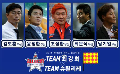 한국프로축구연맹은 10일 "하나은행 2015 K리그 올스타전 '팀 최강희 vs 팀 슈틸리케' 전에서 울산 현대의 윤정환 감독과 인천 유나이티드의 김도훈 감독이 전후반 주심으로 나온다"고 밝혔다.