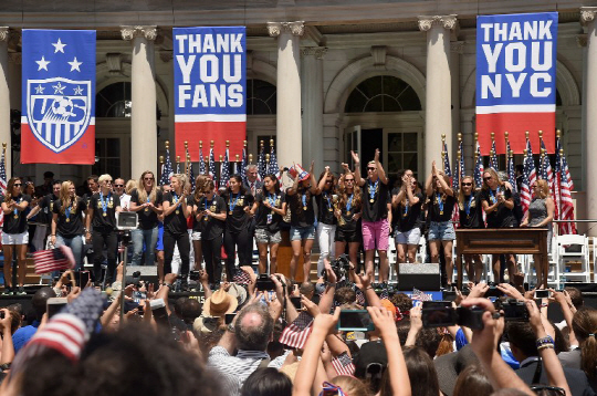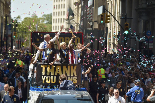 2015년 캐나다여자월드컵 우승을 차지한 미국 여자대표팀이 뉴욕 거리 한복판에서 성대한 카퍼레이드를 펼쳤다고 AFP통신이 11일(한국시각) 전했다.
