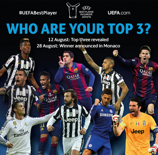 지난 시즌 UEFA 챔피언스리그 우승팀 바르셀로나는 MSN트리오(메시-루이스 수아레스-네이마르)가 당당히 이름을 올렸다. 준우승팀 유벤투스는 잔루이지 부폰, 안드레아 피를로, 아르투로 비달, 폴 포그바, 카를로스 테베스까지 무려 5명을 후보에 올려놓는 기염을 토했다. 이밖에 호날두와 에당 아자르(첼시)까지 총 10명이 최우수선수 후보로 선정됐다.