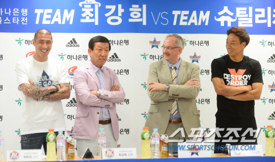 최 감독과 슈틸리케 감독은 각 팀 선수들에 대한 격려도 아끼지 않았다. 동시에 상대팀 선수들에 대한 견제의 메시지도 명확하게 전달했다. 최 감독은 권순태 최철순 김형일 이재성 등 팀 슈틸리케에 속한 전북 제자들을 겨냥했다. 최 감독은 "전북 선수들은 현명하다고 생각한다. 슈틸리케 감독과 오래 생활할지, 나와 오래 생활할지 알아서 잘 판단해서 경기를 해야 할 것이다. 굳이 대표팀에 뜻이 있어서 열심히 한다면 막지는 않겠다"며 웃음을 보였다. 슈틸리케 감독의 무기는 '동아시안컵'이었다. 올스타전 이후 8월 1일부터 9일까지 중국 우한에서 열리는 동아시안컵 출전 명단을 발표하는 슈틸리케 감독은 농담 섞인 '당근'을 던졌다. "선수들의 동기 부여는 언론이 해줬으면 좋겠다. 기사에 '올스타전에서 잘하면 (동아시안컵) 대표팀에 뽑힐 수 있다'고 써달라." 슈틸리케 감독의 얼굴에 묘한 미소가 흘렀다. 이어 "이동국과 에두의 투톱에 대한 대비를 했지만 에두가 이적하는 바람에 다시 작전을 짜고 있다. 이동국이 어떤 플레이를 할지 잘 알고 있어 충분히 막을 수 있다"면서 "후반 추가시간에 차두리의 자책골로 3대2로 승리하겠다"고 덧붙였다. 최 감독 역시 "3대1로 승리하겠다"며 맞불을 놓았다. 전 현 A대표팀 사령탑의 승부욕은 한 여름 밤 축제를 뜨겁게 달구는 예고편이었다. 안산=하성룡 기자 jackiechan@sportschosun.com