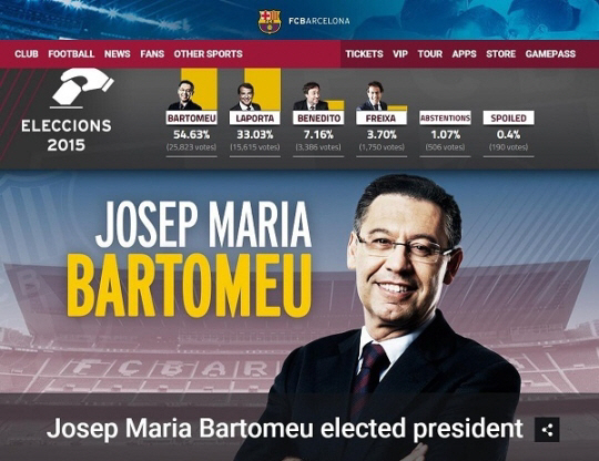 바르셀로나의 선택은 주제프 마리아 바르토메우 현 회장이었다. 바르셀로나는 19일(한국시각) 구단 공식 홈페이지를 통해 신임 회장 선거 결과를 발표했다. 바르토메우 회장은 2만5823표(54.63%)의 지지를 얻어 재선에 성공했다. 지난해 1월 산드로 로셀 회장의 중도 사퇴로 남은 임기를 물려받았던 바르토메우 회장은 앞으로 2021년까지 6년 동안 바르셀로나를 이끌게 됐다.