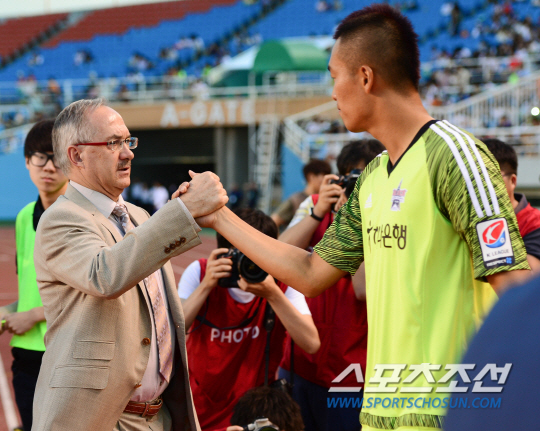 2015 K리그 올스타전 팀 최강희 vs 팀 슈틸리케 경기가 17일 안산 와스타디움에서 열렸다. 슈틸리케 감독이 그라운드에 나오는 김신욱과 악수를 하고 있다. 이날 올스타전은 공식 경기 외에 하프타임 이벤트로 2015 올스타 릴레이 경기가 벌어졌다. 릴레이의 첫 주자는 걸그룹 CLC가 맡아 눈길을 끌었다. 또 CLC와, AOA, 비스트가 축하공연을 펼쳐 경기장을 찾은 축구팬들을 즐겁게 했다. 안산=정재근 기자 cjg@sportschosun.com/2015.07.17/