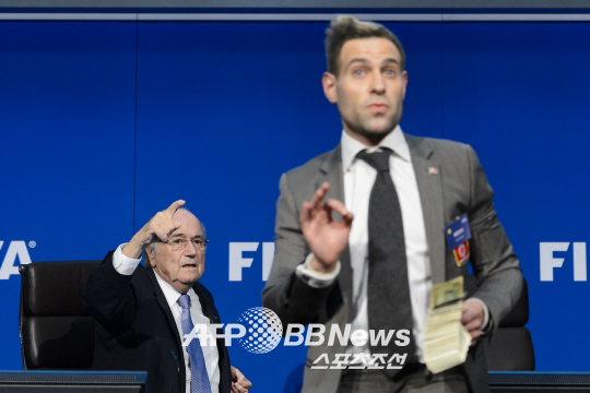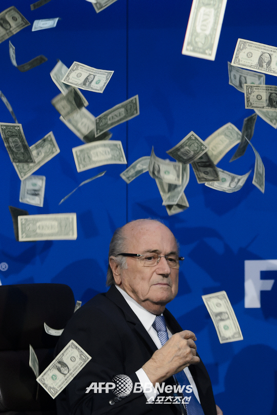 21일(한국시각) 영국 스포츠 전문매체 스카이스포츠에 따르면, 블래터 회장이 스위스 취리히 FIFA본부에서 열린 FIFA 집행위원회에서 차기 FIFA 회장 선거일을 내년 2월27일로 결정한 뒤 이를 공개하는 기자회견에서 돈뭉치 세례를 받았다.