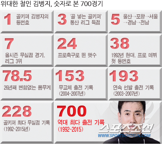 '아름다운 철인' 김병지(45·전남 드래곤즈)가 26일 오후 7시 광양전용구장에서 열리는 K리그 클래식 라운드, 제주와의 홈경기에서 리그 통산 700경기에 나선다. 대기록이 임박한 23일 전남 광양 클럽하우스에서 만난 김병지는 담담했다. 1970년 4월8일생인 그에게 '기록'은 '일상'이다. 김병지가 나서는 매경기는 현역 최고령 출전 기록이다. 153경기 역대 최다 무교체 출전, 역대 최초 골키퍼 득점, 역대 올스타전 최다 출전, 역대 FA컵 최다출전… 1992년부터 2015년까지 K리그 그라운드는 지켜온 '달인'이자 '철인'이 말했다. "700경기도 내겐 또 하나의 경기일 뿐이다. '일상'이자, 직업선수로 26년간 쭉 지켜온 '리듬'이다. '그래도 계속 가라'는 책 제목처럼 뚜벅뚜벅 계속 걸어가다보니 여기까지 왔다."