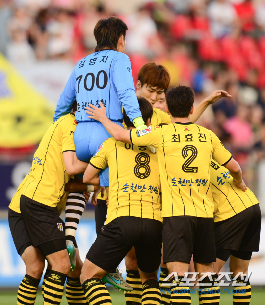2015 K리그 클래식 전남 드래곤즈와 제주 유나이티드의 23라운드 경기가 26일 광양 축구전용구장에서 열렸다. 전남 이종호가 첫 골을 넣은 가운데 선수들이 김병지를 손가마 태우는 세리머니를 하고 있다. 이날 경기에 출전한 전남 골키퍼 김병지는 1992년 울산 현대에서 처음으로 K리그 무대를 밟은 이래 24년 동안 선수생활을 이어오며 프로 700경기 출전이라는 금자탑을 세웠다. 광양=정재근 기자 cjg@sportschosun.com/2015.07.26/