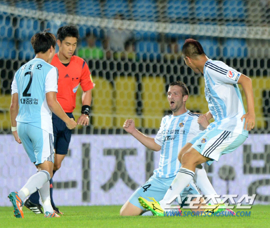 | ◇코바(가운데)가 지난 22일 탄천종합운동장에서 가진 성남과의 2015년 FA컵 8강전에서 1-1 동점이던 연장전반 3분 왼발 결승골을 터뜨린 뒤 주먹을 불끈 쥔 채 환호하고 있다. 성남=허상욱 기자 wook@sportschosun.com |