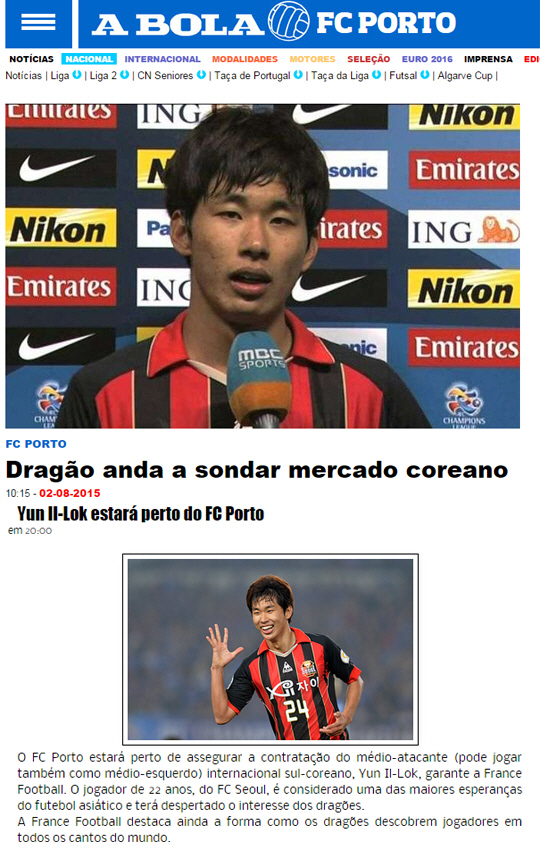 프랑스 축구전문지 프랑스풋볼은 2일(한국 시각) "포르투가 서울의 윙어 윤일록 영입에 가까워졌다"라고 보도했다.