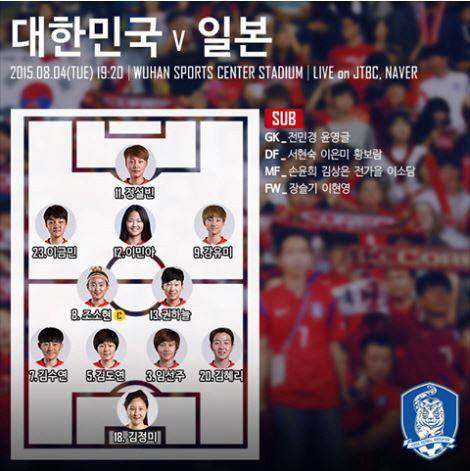 일본전에서 윤덕여 여자대표팀 감독은 중국전의 공격라인을 그대로 유지했다. 중국전 환상적인 무회전 킥으로 결승골을 터뜨린 정설빈(인천 현대제철)이 원톱, 영리한 드리블로 분위기를 주도한 이민아(인천 현대제철)가 섀도스트라이커로 나섰다. 좌우 날개 이금민(서울시청), 강유미(화천 KSPO)도 2경기 연속 선발 출전한다. 캡틴 조소현(현대제철)과 센추리클럽 가입을 1경기 남긴 권하늘(부산상무) 콤비가 중원을 지킨다. 포백 라인은김수연(화천 KSPO), 김도연, 임선주, 김혜리(이상 인천 현대제철)가 지킨다. 중국전에서 부상 투혼, 폭풍 선방을 펼친 맏언니 김정미(인천 현대제철)가 골키퍼 장갑을 꼈다. 전영지 기자 sky4us@sportschosun.com