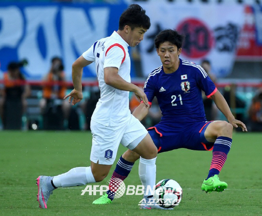 지난 북한전에서 후반전 급격한 체력 저하로 역전패를 맛봤던 일본은 전반 초반 수비라인을 내리며 신중하게 경기를 운영했다. 자연스럽게 한국이 볼 점유율을 얻고 경기를 주도했다. 그러나 촘촘하게 포진한 일본 수비 속에서 패스 진로를 찾지 못했다. 잇달아 나온 패스 미스도 아쉬움을 남겼다. 전반 15분 아크 왼쪽에서 김민우가 시도한 오른발슛으로 겨우 포문을 열었다.