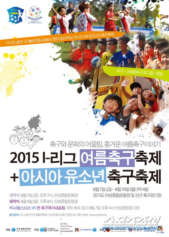 제3회 I-리그 여름축구축제 및 아시아 유소년 축구축제가 7~10일까지 3박4일간 안성종합운동장 및 인근 15개 축구경기장에서 펼쳐진다. 아시아 15개국 266개 유소년 팀 등 6000여 명이 참여하는 이번 대회는 국민생활체육회, 전국축구연합회 유청소년 연맹과 안성시 생활체육회가 주관하고 문화체육관광부, 외교부, 국민체육진흥공단, 안성시가 후원하는 축구 축제다. 8~9일 이틀간 532경기가 진행되며, 교육 문화 체험 프로그램 및 공연, 캠핑 프로그램을 통해 아시아 유소년 선수들과 가족에게 특별한 재미와 추억을 선사한다. 개막일인 7일 오후 4시에는 개막전 축하행사로 연예인 축구단 'FC 서울 스타즈'와 '전 국가대표팀'의 친선전이 열린다. 정준호, 정두홍, 김보성, 김현욱, 노지훈, 이수근, 탁재훈 등 인기 연예인들과 국가대표 출신 송종국, 안효연, 이태호 등이 출전할 예정이다. 전국 유청소년 축구연맹 관계자는 "올해로 3회째 열리는 이번 축구축제가 세대와 장소를 초월한 소통은 물론, 축구축제를 참가하는 한국과 아시아 국가 유소년 선수들의 어울림의 공간이 되기를 기대한다"고 말했다. 문의는 전국 유청소년 축구연맹 (02)780-3999, http://www.nyff.or.kr