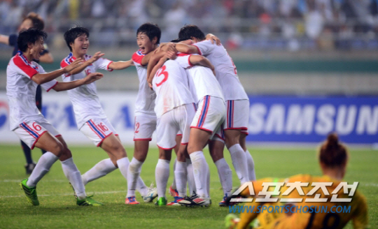 29일 오후 인천 문학경기장에서 2014 인천 아시안게임 축구 여자 한국과 북한의 경기가 열렸다. 종료 직전 허은별의 역전골로 결승행을 확정지은 북한 선수들이 환호하고 있다. 인천= 김경민 기자 kyungmin@sportschosun.com / 2014.09.29. |