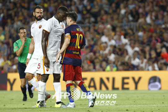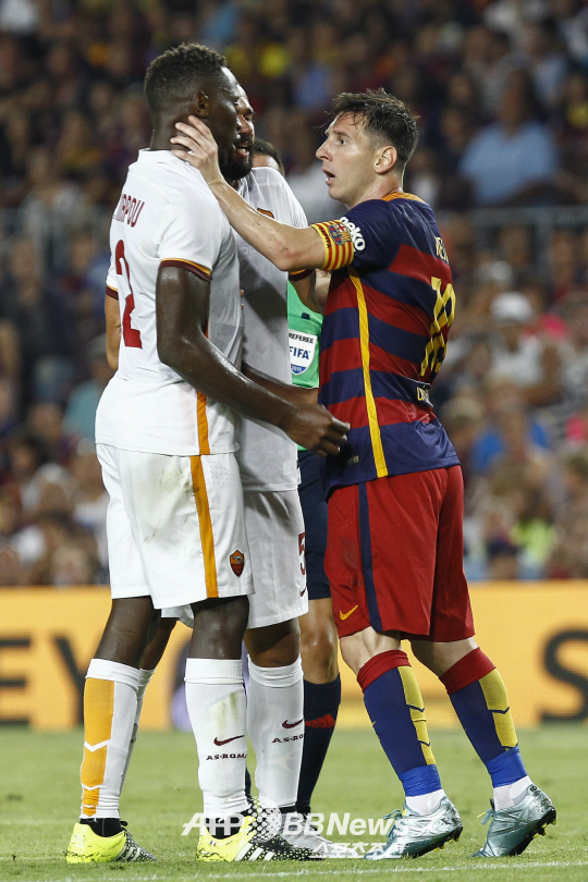 메시는 6일(한국 시각) 스페인 바르셀로나의 캄프누에서 열린 2015 감페르 트로피 AS로마 전에서 전반 35분 상대 수비수 마푸 양가 음비와와 감정 충돌을 벌였다.