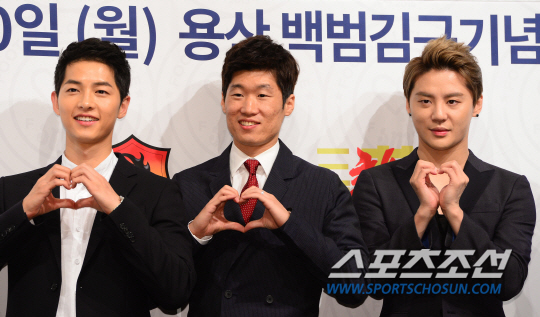 | ◇박지성(가운데)이 10일 서울 효창동 백범김구기념관에서 펼쳐진 FC스마일 창단식에서 배우 송중기, 가수 김준수와 함께 하트 세리머니를 펼치고 있다. 송정헌 기자 songs@sportschosun.com |