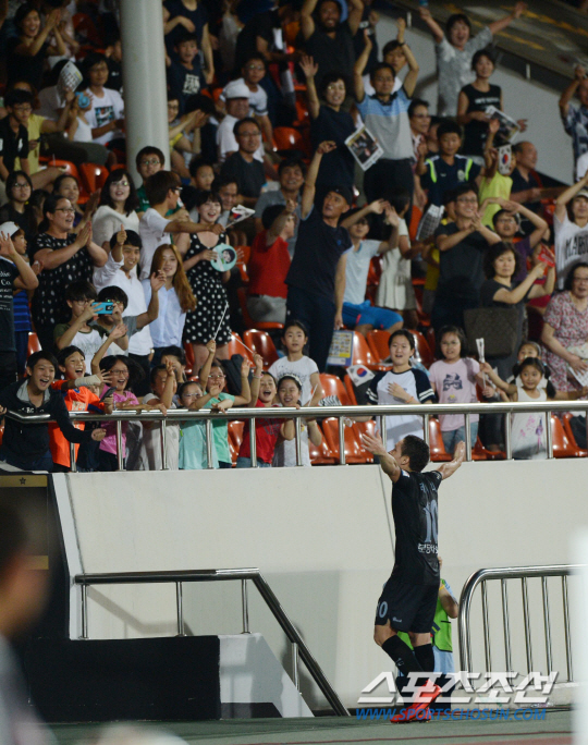 ◇레이나가 12일 탄천종합운동장에서 열린 제주와의 2015년 현대오일뱅크 K리그 24라운드에서 후반 39분 동점골을 터뜨린 뒤 관중석 앞에서 두 팔을 벌린 채 환호하고 있다. 성남=허상욱 기자 wook@sportschosun.com