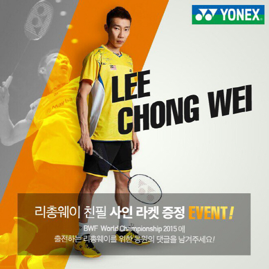 요넥스 코리아는 최근 세계배드민턴선수권대회(10∼16일) 개막을 맞아 'BWF World Championship 2015 출전 기념, 리총웨이 친필 사인 라켓 증정 이벤트'를 선보였다. 리총웨이는 말레이시아의 스포츠스타로 배드민턴 남자단식 최강으로 꼽힌다. 한동안 세계랭킹 1위를 차지했던 그는 지난해 덴마크 세계개인선수권대회에서 은메달을 획득한 이후 도핑검사에 적발됐다.