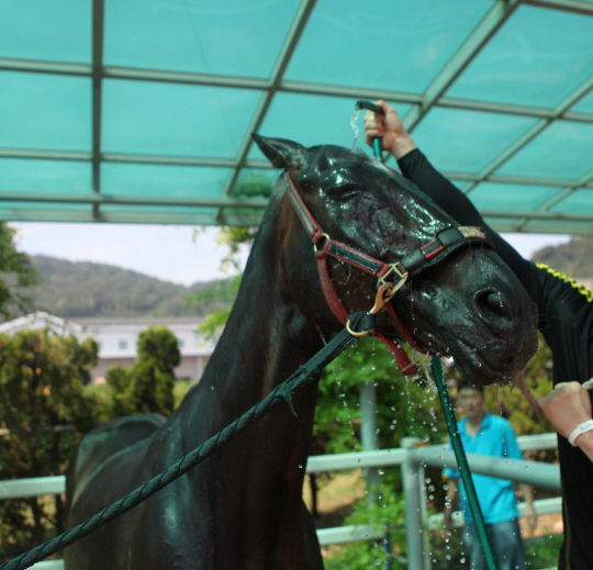 연일 찜통더위가 이어지고 있다. 빗줄기가 한 차례 훑고 지나간 땅은 햇빛 속에 다시 '온돌판'이 되기 일쑤다. 냉방 장비의 혜택이 그래서 고맙다. 하지만 선풍기 하나 제대로 쓸 수 없는 경마장의 말들은 과연 '폭염'을 어떻게 견디고 있을까.