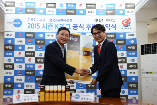 연맹과 한국먼디파마는 20일 서울 신문로에 위치한 축구회관 5층 집현전에서 이종호 한국먼디파마사장과 허정무 연맹 부총재가 참석한 가운데 K리그 공식 후원에 대한 계약을 체결했다. 이번 후원 계약을 통해 한국먼디파마는 약 1년간 K리그 공식 후원사로 활동한다. K리그 클래식과 챌린지 전체 23개 구단 경기장에서 펼쳐지는 경기에 간편하게 뿌리는 살균소독제 베타딘® 드라이파우더스프레이와 습윤드레싱재메디폼®에 대한 광고와 홍보, 이벤트 등 다양한 프로모션을 진행할 예정이다.
