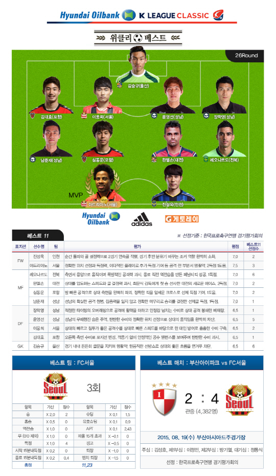 이적생 돌풍 아드리아노(FC서울) K리그 클래식 26라운드 '별중에 별'로 떠올랐다.