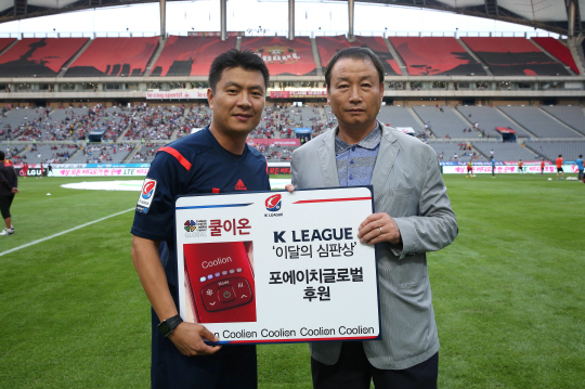 프로축구연맹이 7월 '4H 글로벌 쿨이온 이달의 심판'에 선정된 김동진 주심(43)에 대한 시상식을 22일 K리그 클래식 서울-대전 경기를 앞두고 서울월드컵경기장에서 진행했다.