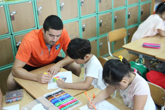 수원FC는 25일 오전 수원 권선초등학교(교장 오형근)를 방문해 뇌성마비를 앓고 있는 김나예 양(8)을 비롯한 학급 친구들과 반가운 만남을 가졌다. 지난 5월 진행한 수원FC 홈경기 이벤트 '수원FC, 소원을 들어줘'를 통해 김양과 소중한 인연을 맺은 뒤 지속적인 만남을 이어가고 있는 수원FC는 이날 김양의 학급을 깜짝 방문해 함께 수업에 참여하며 즐거운 시간을 보냈다.