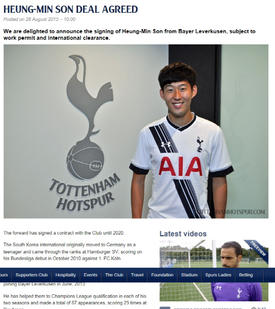 토트넘은 28일(한국시각) 홈페이지를 통해 최근 메디컬 테스트를 통과한 손흥민에 대한 이적 계약을 완료했다고 발표했다. 계약기간은 2020년까지 5년이다. 이적료는 3000만 유로(약 403억 원) 수준인 것으로 알려졌다. 등번호는 7번을 받았다. 손흥민은 13번째 한국인 프리미어리거가 됐다.