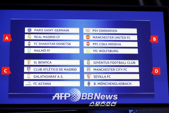 ▲ A조= 파리 생제르맹(프랑스), 레알 마드리드(스페인), 샤흐타르 도네츠크(우크라이나), 말뫼(스웨덴)