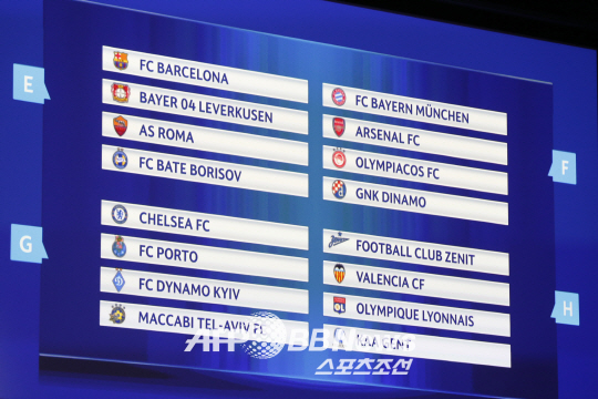 지난 시즌 우승팀 FC바르셀로나(스페인)는 레버쿠젠(독일), AS로마(이탈리아), 바테 보리소프(벨라루스)와 함께 E조에 편성됐다.