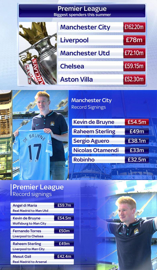 이중 약 64%에 달하는 1억 350만 파운드(약 1890억원)가 케빈 데 브루잉(24)와 라힘 스털링(21) 영입에 쓰였다. 데 브루잉은 5450만 파운드, 스털링은 4900만 파운드의 몸값을 기록했다. 이는 맨시티 역대 이적료 1-2위 금액이다. EPL 역대로 따져도 앙헬 디 마리아(5970만 파운드), 페르난도 토레스(5000만 파운드) 등에 이어 2위와 4위에 랭크되는 거액이다.