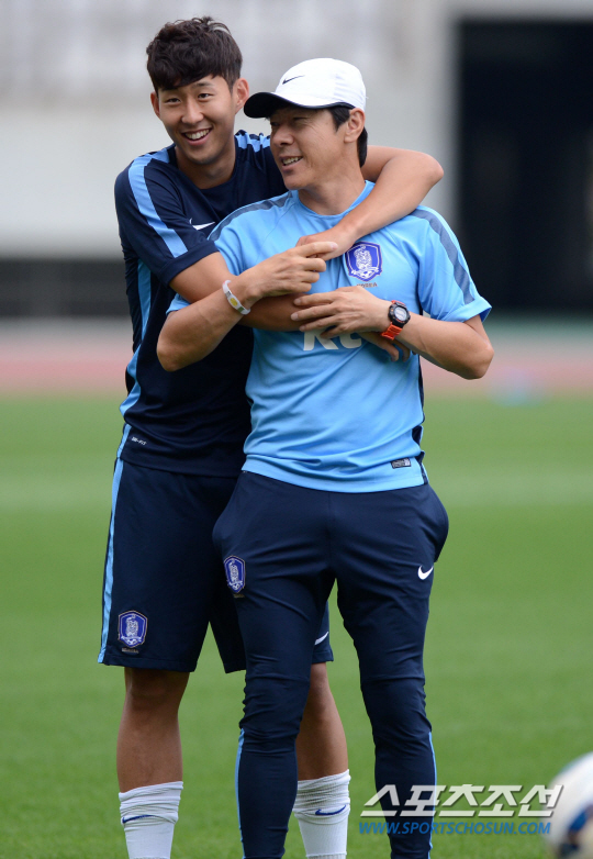◇손흥민이 31일 경기도 화성종합경기타운에서 열린 A대표팀 훈련에 앞서 신태용 코치와 다정한 포즈로 이야기를 나누고 있다. 화성=허상욱 기자 wook@sportschosun.com