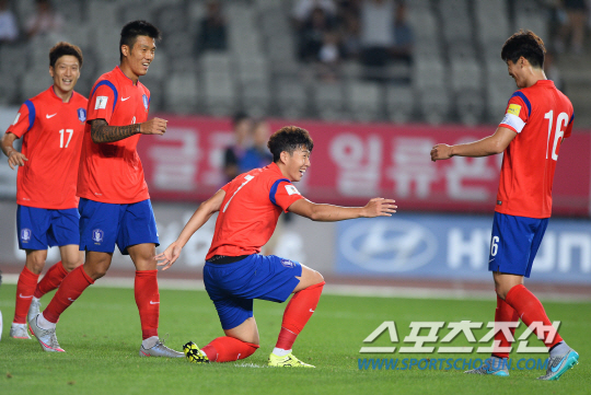 | ◇손흥민(오른쪽 두 번째)이 3일 경기도 화성종합경기타운에서 열린 라오스와의 2018년 러시아월드컵 아시아지역 2차예선 G조 2차전에서 1-0으로 앞서던 전반 11분 두 번째 골을 터뜨린 뒤 동료들의 축하를 받고 있다. 화성=송정헌 기자 songs@sportschosun.com |