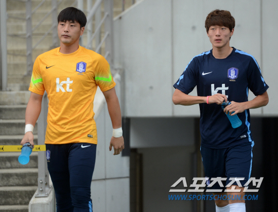 2018 러시아 월드컵 아시아지역 2차 예선 라오스와 레바논전을 앞둔 축구대표팀 슈틸리케호가 31일 경기도 화성종합경기타운에서 훈련을 가졌다. 권순태와 황의조가 그라운드로 들어서고 있다. 대표팀은 9월 3일 경기도 화성에서 라오스, 8일 레바논 베이루트에서 레바논과 아시아지역 2차 예선을 치른다. 화성=허상욱 기자 wook@sportschosun.com/2015.08.31/ |