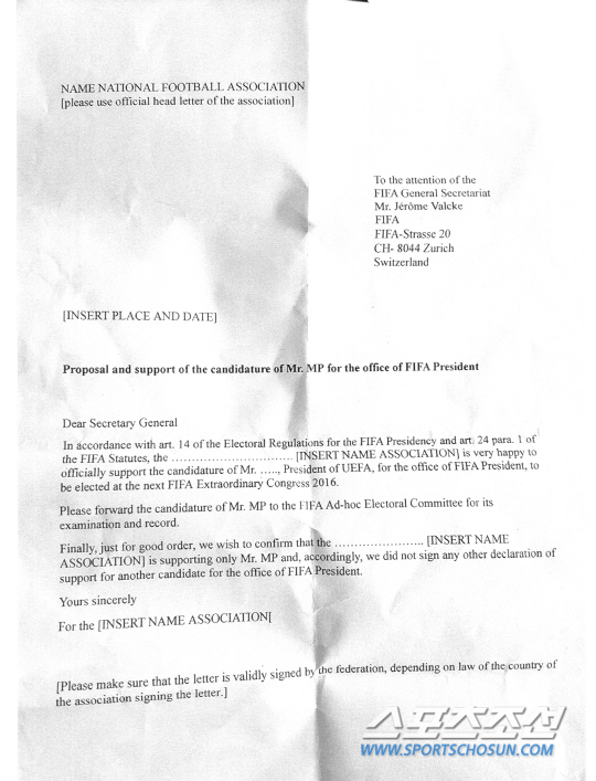 정 회장에 따르면 세이크 살만 빈 에브라힘 알 칼리파 AFC 회장(바레인)이 최근 한국과 요르단을 제외한 회원국들에게 플라티니를 FIFA 회장으로 추대한다는 추천서 양식을 보냈다고 한다. 요르단의 경우 알리 빈 알 후세인 왕자가 FIFA 회장 선거에 재도전할 계획을 세우고 있다. 중국, 일본, 몽골, 인도, 싱가포를 등 대부분의 회원국들이 서신을 받은 것으로 확인됐단다. 그런데 추천서의 답신은 AFC가 아닌 FIFA에게 보내도록 했다. 정 회장이 공개한 서한에는 제롬 발케 FIFA 사무총장의 이름이 선명했다. 특히 서한에는 오로지 플라티니만을 지지하고 그 외에는 누구도 지지하지 않겠다는 각서까지 포함돼 논란이 일고 있다.