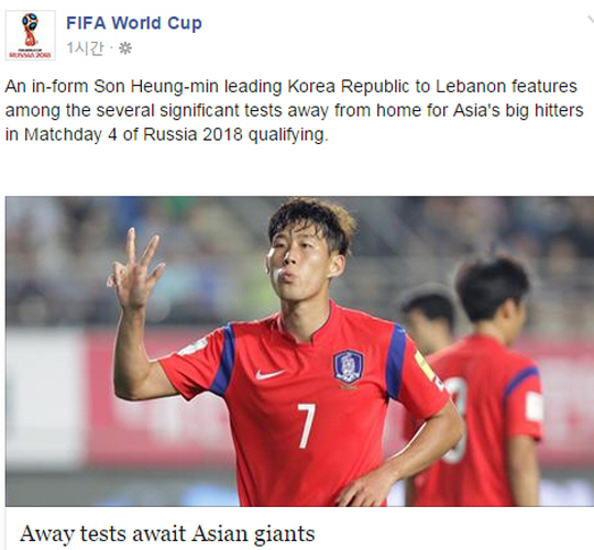 하지만 FIFA는 손흥민의 레바논 전 불참을 미처 몰랐던 것 같다. FIFA는 "최근 EPL 토트넘으로 이적한 손흥민은 지난 라오스 전에서 해트트릭을 기록하는 등 쾌조의 컨디션을 보이고 있다. 그의 어깨에 4년 전의 복수가 달렸다"라며 그를 이번 A매치데이의 '주목할만한 선수(Player to watch)'로 선정해 소개하는 실수를 저질렀다. 프리뷰의 대표 사진에도 손흥민의 얼굴이 걸렸다.