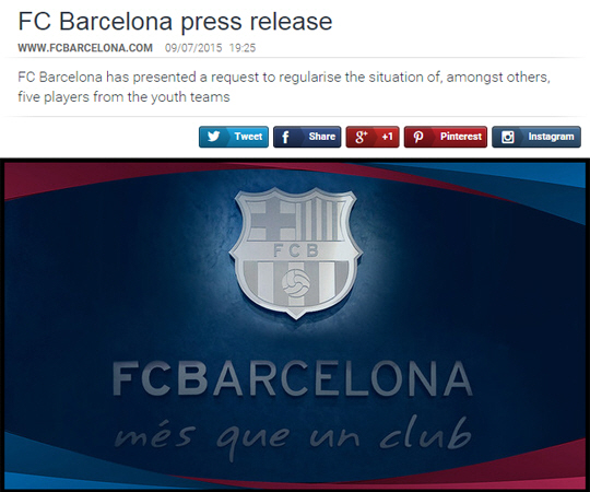 바르셀로나는 8일(한국 시각) 공식 홈페이지를 통해 "국제축구연맹(FIFA)의 징계에 따라 바르셀로나는 유소년팀으로부터 5명의 선수를 방출한다"라고 밝혔다.