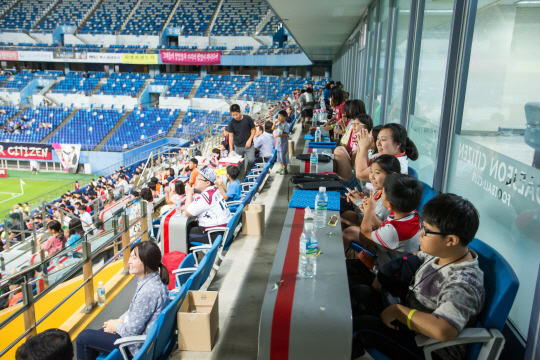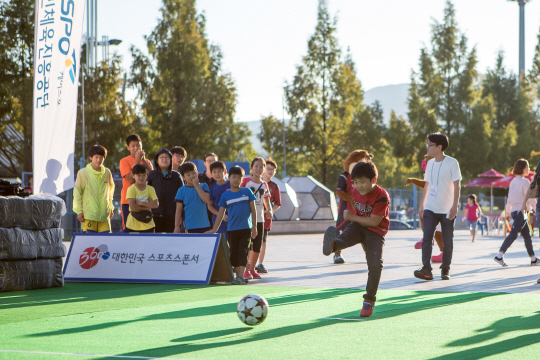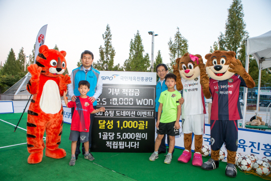 국민체육진흥공단(KSPO·이사장 이창섭)이 9일 오후 대전-제주 간의 K리그 클래식 29라운드가 열린 대전월드컵경기장에 복지시설 아동 200여명을 초청, '복지시설과 함께하는 스포츠 관람 및 360° 슈팅 도네이션 이벤트'를 개최했다. 아동복지시설 스포츠용품 구입 지원 모금행사인 '360° 슈팅 도네이션' 이벤트는 대전월드컵경기장 남문광장에 간이 골대를 설치한 뒤 이벤트에 참여한 축구팬이 페널티 킥을 성공할 때마다 5000원씩 적립하는 방식으로 진행됐다. 이날 경기장을 찾은 시민들의 참여로 총 500만원의 기부금이 조성됐다. 이날 조성된 기부금은 경기장을 찾은 아동복지시설에 스포츠용품을 구입하여 9월 중 지원할 예정이다. 복지시설 아동들은 이날 간식과 함께 K리그를 무료 관람하며 즐거운 시간을 보냈다.