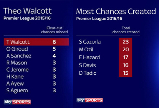'놓친 골 찬스(clear-cut chances missed)'에 대해 옵타 측은 "누가 봐도 골을 넣을 것이라고 합리적인 기대가 되는 상황"이라고 정의하고 있다. 월콧은 올시즌 아르센 벵거 감독에 의해 주전급 포워드로 기용되면서 단연 이 부문 선두를 달리고 있다. 매체는 올시즌 리그 1골을 기록중인 월콧이 "이미 6번의 완벽한 골찬스를 놓쳤다"라고 지적했다.