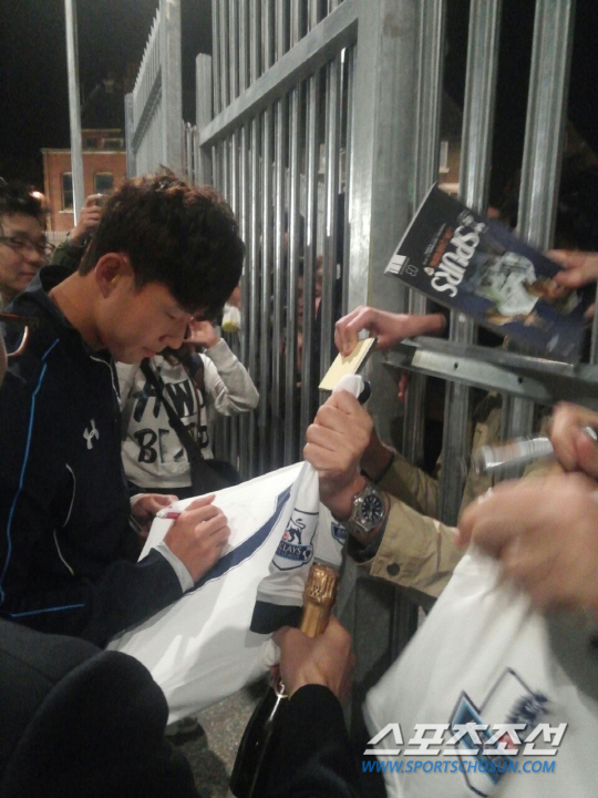 경기가 끝나고 2시간이 지난 뒤 손흥민은 겨우 퇴근길에 올랐다. 하지만 많은 팬들이 손흥민을 기다렸다. 손흥민은 그런 팬들에게 다가가 일일이 사인을 하고, 사진을 찍었다. 팬들은 그런 손흥민에게 한 목소리로 외쳤다.