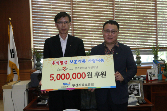 렛츠런파크부산경남이 지난 9일 소외된 고령 보훈가정을 위한 '사랑나눔 후원금' 500만원을 부산지방보훈청(청장 전홍범)에 전달했다. 이번 후원금은 추석 때 혼합잡곡(현미찹쌀, 찰보리쌀, 기장쌀, 검정찹쌀, 찹쌀)으로 고령 저소득 보훈가족 세대에 지원될 예정이다. 렛츠런부경 측은 "이러한 사회공헌사업이 나라를 위해 희생하고 공헌한 국가유공자(유족) 등에 대한 자긍심과 긍지를 느낄 수 있는 분위기를 조성하고 추석명절을 맞이해 지역사회의 따뜻한 온정을 느끼는 계기가 될 것으로 기대된다"고 밝혔다.