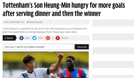 영국 대중일간 미러지는 손흥민이 구단 동료들에게 한식을 대접한 일을 재언급했다. '손흥민이 디너(dinner) 대접후 위너(winner)가 됐다'는 타이틀 아래 '여름 입단 이후 토트넘에 한식과 골을 함께 쏜 손흥민은 토트넘의 취향이 됐다'고 썼다. 손흥민의 골 사진 아래 '저녁은 내가 책임져(Dinner's on me)'라는 코믹한 제목을 달았다. '손흥민은 유로파리그 2골에 이어 이날 크리스탈팰리스에서 데뷔골을 쏘아올리며 토트넘의 새 영웅(new hero)이 됐다'고 덧붙였다.