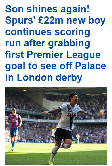 영국 일간 데일리메일은 20일 밤(한국시각) 크리스타팰리스전 손흥민의 리그 데뷔골이자 1대0 승리를 이끈 결승골 직후 이런 타이틀을 달았다. '이 문구를 계속 사용하게 될 것같다. 손흥민이 토트넘에 가져온 임팩트는 매우 깊다'고 썼다. '토트넘 서포터들이 풀타임 휘슬이 울리자 'SON, 계속 앞으로!(Go on My SON) '를 한목소리로 외쳤다고 덧붙였다. '태양(SUN') '아들(SON)'의 중의법을 이용한 홈팬들의 응원속에는 신입생 손흥민에 대한 기대와 애정이 듬뿍 담겼다.