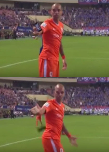 지난 20일 열린 상하이 선화-산둥 루넝 간의 2015년 중국 슈퍼리그에서는 재미있는 장면이 펼쳐졌다. 산둥이 1-0으로 앞서던 전반 볼을 잡기 위해 사이드라인으로 달려가던 산둥 소속 공격수 디에고 타르델리(브라질)를 향해 괴물체가 날아들었다. 상하이 팬이 던진 것으로 추정되는 물체는 다름 아닌 유명 스마트폰이었다. 바나나 등 이물질을 던지는 경우는 잦지만, 개인정보가 가득 담긴 고가의 스마트폰을 던진 것은 일면 이해가 가지 않는 부분이다.