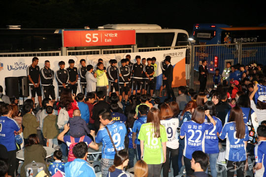 짜릿한 3대2 역전승으로 홈 경기를 마무리 한 울산 현대 구단 프런트들은 눈코 뜰 새 없이 바빴다. 경기장 남문 광장에서 펼쳐질 '뒷풀이' 준비 때문이다. 울산은 올 시즌 홈 경기 승리 시 선수단 전원이 남문 광장으로 이동해 팬들과 함께 승리의 기쁨을 나누는 행사를 이어오고 있다. 시즌 개막 전 우승 후보로 여겨졌으나 성적이 바닥을 치면서 기대 만큼의 행사 실적을 올리진 못했다. 하지만 선수단이 '경기 뒤 숙소 이동' 이라는 공식을 과감히 깨고 팬들과 어울리는 시간을 만든 것은 K리그 내에서 쉽게 찾아볼 수 없는 '진풍경'이다.