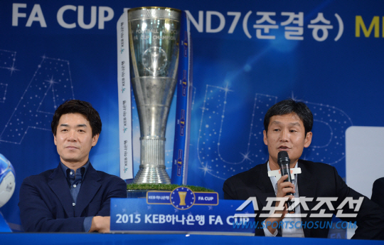 2015 KEB 하나은행 FA컵 준결승 미디어데이가 24일 서울 신문로 축구회관에서 열렸다. 준결승에서 만나게 된 울산 윤정환 감독과 서울 최용수 감독이 취재진의 질문에 답하고 있다. 허상욱 기자 wook@sportschosun.com/2015.09.24/ |